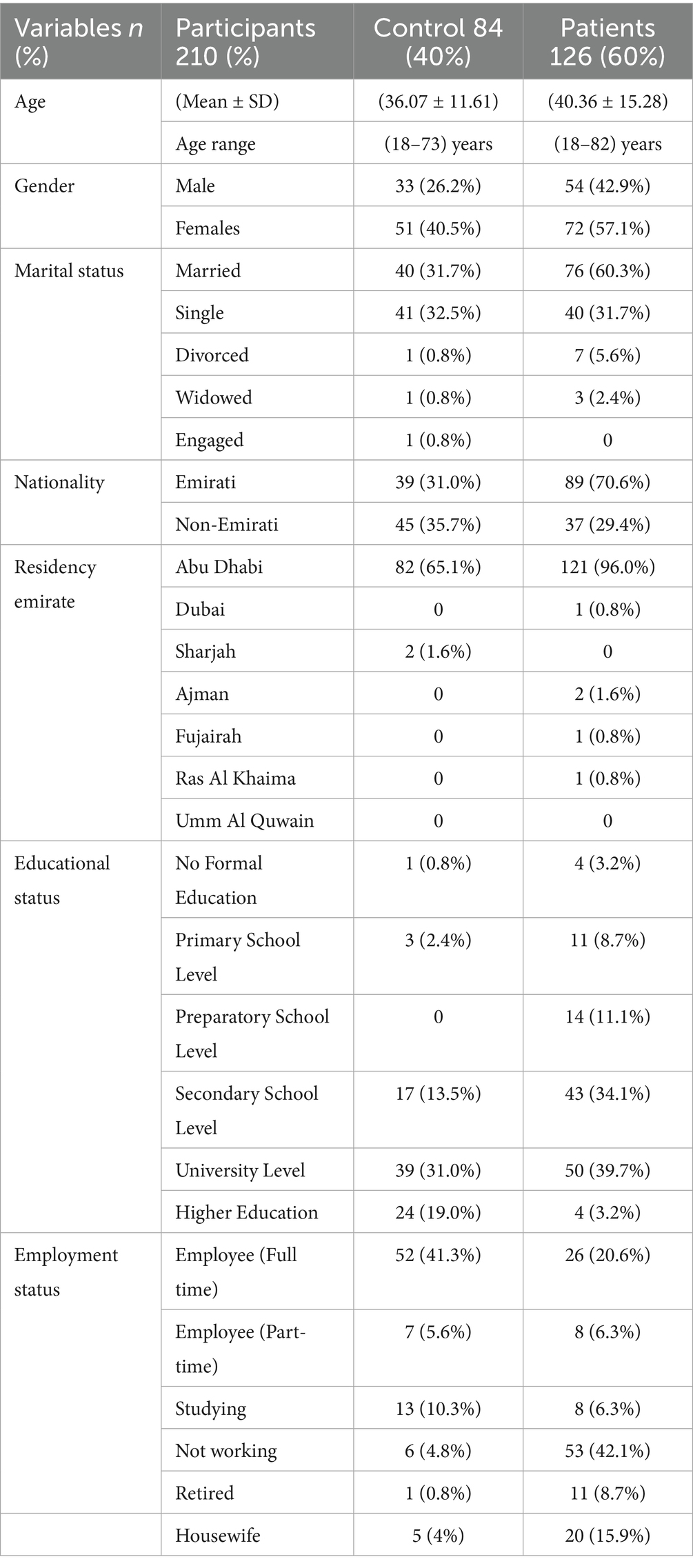 The Arabic version of the SSTIC-E was administered to a total of 210 participants, including 126 patients and 84 healthy control participants. Table 1 presents the typical characteristics of participants, including demographic information such as age, gender, marital status, nationality, residency emirate, educational status, and employment status. The table also provides the number and percentage of participants in each category and the mean, minimum, and maximum age.