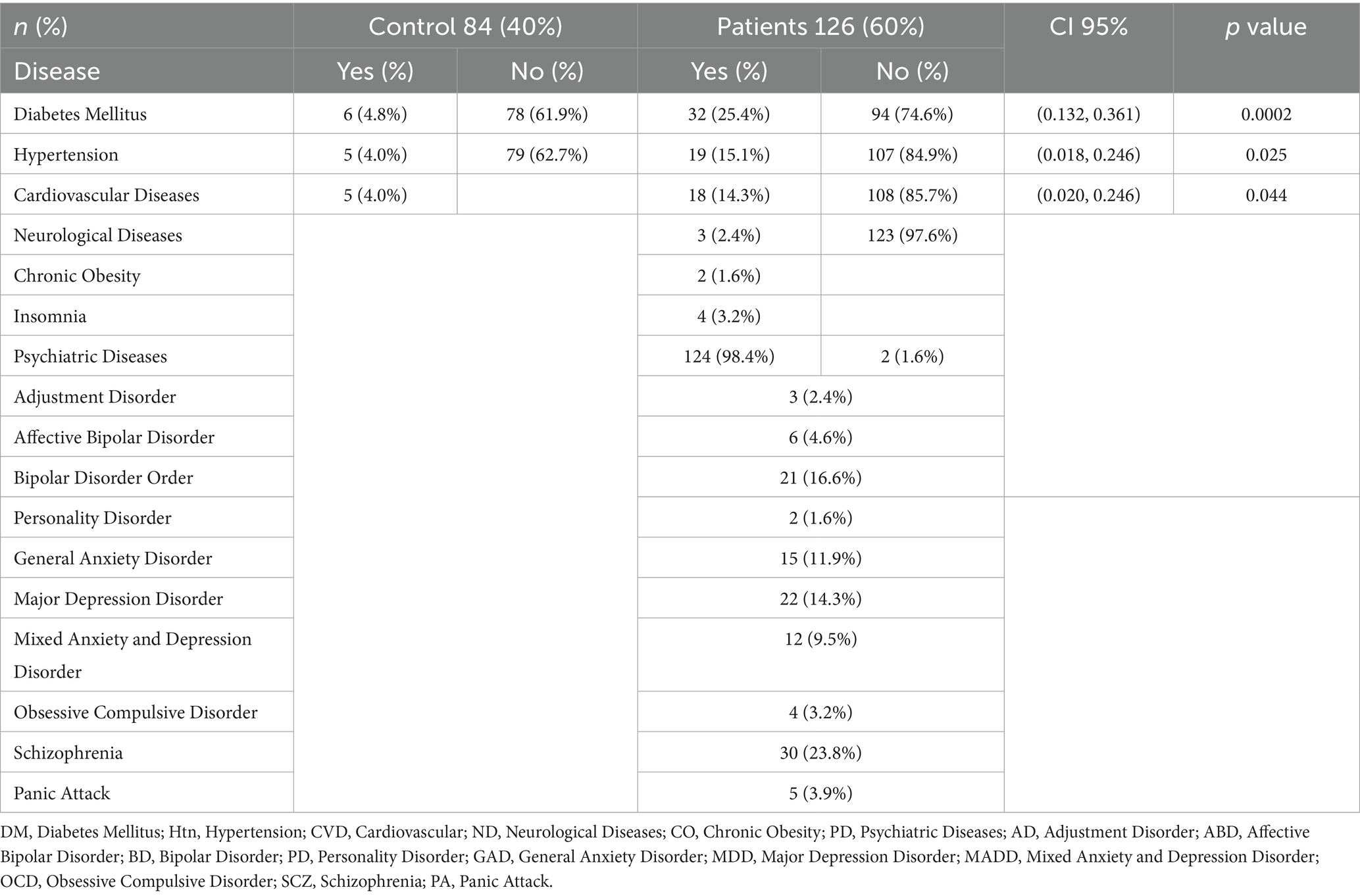 In the control group (non-psychiatric patients), 4.8% of participants reported having diabetes, while 61.9% did not have diabetes. In the patient group, 25.4% of participants reported having diabetes, while 74.6% did not. Similarly, in the patient group, 14.3% of participants reported having major depressive disorder (MDD), while in the control group, no participants reported having this disorder (see Table 2).
