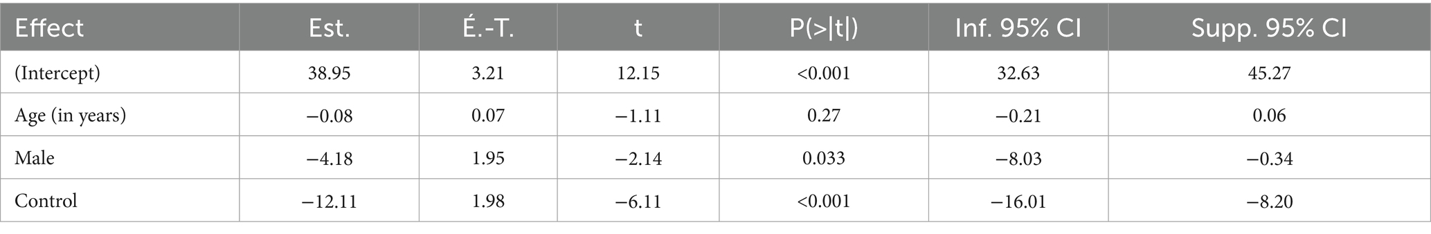 We evaluated whether there are age or gender effects on the SSTICS-E. As there was a group effect, we added age and gender in linear regression (see Table 3).