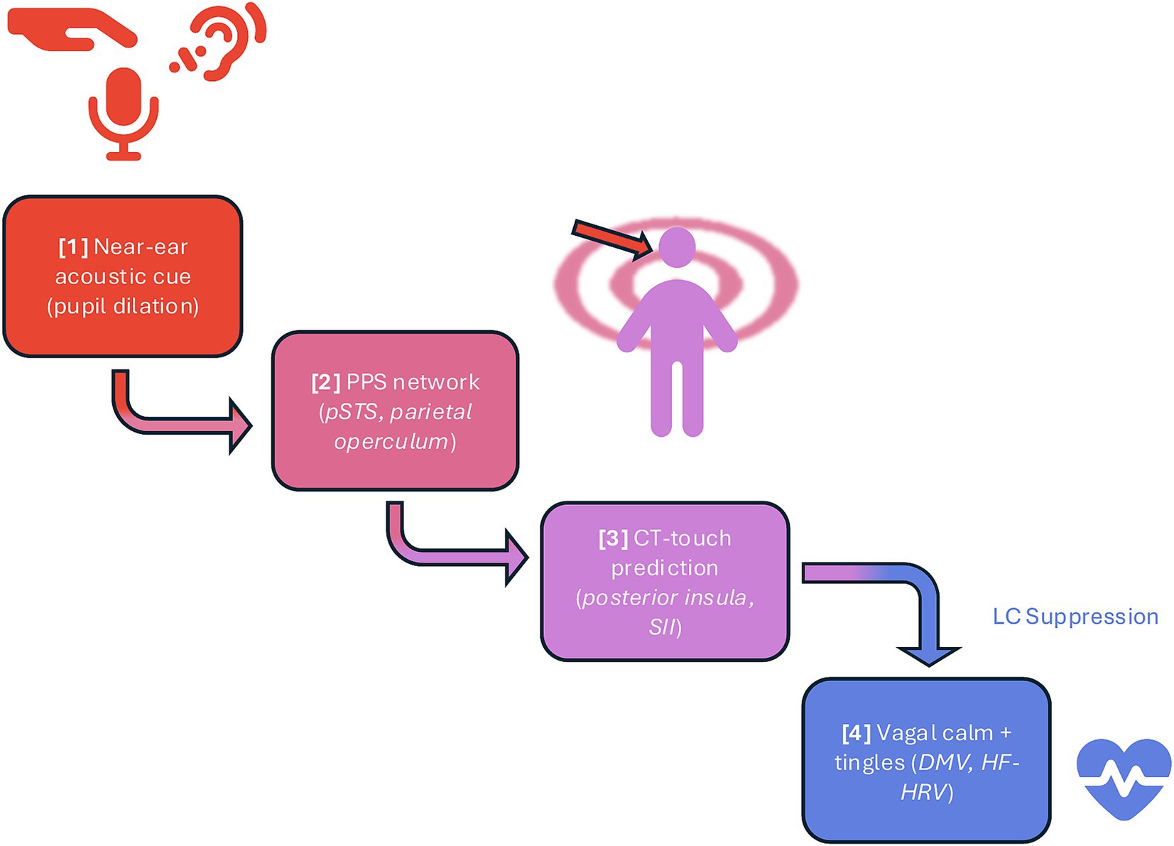 These findings demonstrate that the posterior STS, inferior parietal cortex, and the parietal operculum behave like proximity detectors, amplifying their response when an auditory object crosses the PPS boundary, and is therefore likely to make physical contact. This supports the notion that sound proximity is a potent modulator of sensory integration and may explain how ASMR content elicits embodied responses despite being purely auditory. Within this framework, PPS responses could be generating a transient orienting mismatch, when a stimulus is detected inside the boundary without accompanying tactile confirmation. This mismatch could recruit sympathetic arousal to heighten vigilance, but once sensory prediction resolves in favour of a safe, affiliative source, parasympathetic accommodation then follows. ASMR may therefore harness this sequential PPS dynamic, beginning with an alerting phase and culminating in vagal release. Such proximity-sensitive firing is proposed to represent the first node in the PPH cascade, the moment when the brain interprets near-ear sounds as predictive of imminent affective touch, triggering downstream autonomic changes detailed in the next sections (see Figure 1).
