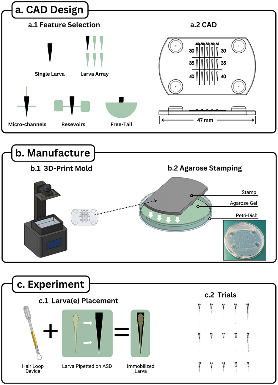 Schematic diagram illustrating the process flow for immobilizing larvae. Section a shows CAD design with feature selection, including single larva, array stamp, micro-channels, reservoirs, and free-tail. Section b depicts manufacture steps: 3D-print mold and agarose stamping with labeled components including a stamp, agarose gel, and Petri dish. Section c describes the experiment process: larva(e) placement using a hair loop device, pipetted larvae, and immobilization, followed by trials showing multiple immobilized larvae images.