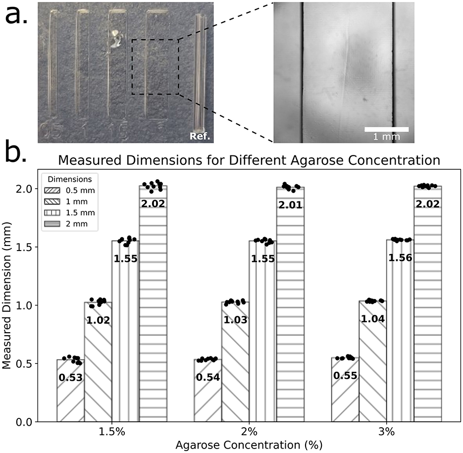 b. Bar graph depicting measured dimensions for agarose concentrations of 1.5 percent, 2 percent, and 3 percent. Each concentration shows bar heights for dimensions of 0.5 millimeters, 1 millimeter, 1.5 millimeters, and 2 millimeters, with data points indicating values around these dimensions.