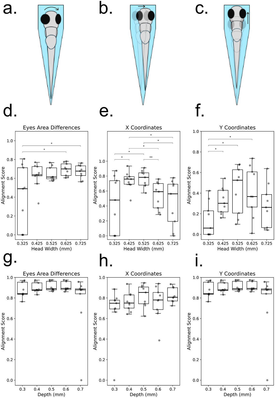 Figure 3. Influence of zebrafish larval positioning on alignment metrics in a microfluidic channel. (a–c) Schematic representations of common misalignments and instabilities observed when zebrafish larvae are positioned in a microfluidic channel: (a) Rotation along the anteroposterior (AP) axis, identifiable by asymmetrical eye positioning; (b) Mediolateral (ML) displacement, characterized by lateral shifts in eye positions along the x-axis; (c) Anteroposterior (AP) displacement, observed as shifts in eye positions along the y-axis. (d–f) Alignment scores for zebrafish larvae with different head widths at a fixed channel depth, quantified using three criteria: (d) Eye area asymmetry, where significant differences are observed between groups 1 and 4 (p = 0.02706) and groups 1 and 5 (p = 0.03910) (Welch's t-test); (e) X-axis displacement, showing significant differences for multiple comparisons: group 1 vs. 2 (p = 0.04048), group 1 vs. 3 (p = 0.02865), group 2 vs. 4 (p = 0.01505), group 2 vs. 5 (p = 0.02234), group 3 vs. 4 (p = 0.00664), and group 3 vs. 5 (p = 0.01471) (Welch's t-test); (f) Y-axis displacement, with statistically significant differences observed for groups 1 vs. 2 (p = 0.02648), groups 1 vs. 3 (p = 0.01294), and groups 1 vs. 4 (p = 0.01655) (Mann–Whitney U-test). (g–i) Alignment scores for zebrafish larvae with different depths at a fixed head width, assessed using the same three criteria: (g) Eye area asymmetry, (h) X-axis displacement, and (i) Y-axis displacement. Individual data points are displayed on each box plot, with statistical significance indicated.