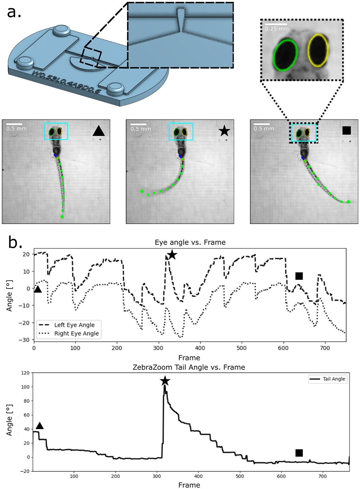 Figure 4. Larvae eye and tail tracking. A head fixed with free tail feature was designed to test eye and tail tracking with an optokinetic response protocol. (a) Device design and key frames from trial. A tapered section of the tail leads toward a wide cavity to fix the larva body while allowing for tail movement. A recorded video of this trial was passed through ZebraZoom for tail tracking (green dots on the tail) and that same video was ran through custom-made eye tracking software (teal bounding box). (b) The resulting eye tracking and tail tracking over time plots from our custom software and ZebraZoom respectively. Keyframes from (a) are displayed on the plots to display representative tail extrema and eye positions.
