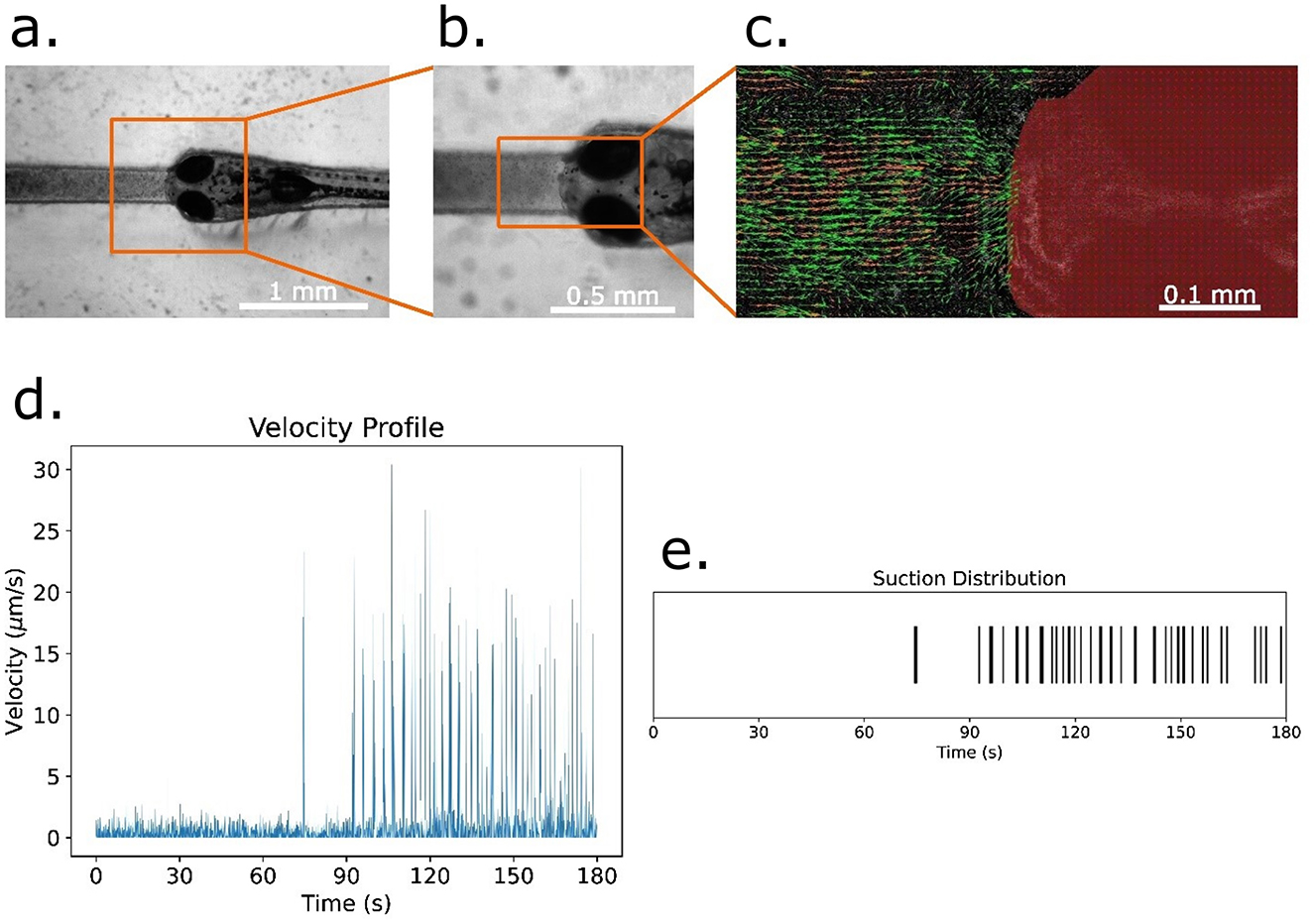 Figure 5. Analysis of food particle suction and velocity in zebrafish larvae. (a) Zebrafish larva immobilized within a microfluidic slot designed using an agarose stamping device for food-suction analysis. (b) Magnified view of the larva within the slot, highlighting its constrained position for controlled observations. (c) Particle Image Velocimetry (PIV) Analysis of food particle motion near the larva's mouth. Velocity vectors represent particle displacement within a single frame. (d) Temporal profile of the average velocity of food particles across all frames during a 3-min experiment. (e) Suction event distribution over time, extracted from velocity measurements by identifying peak velocity occurrences as suction events.