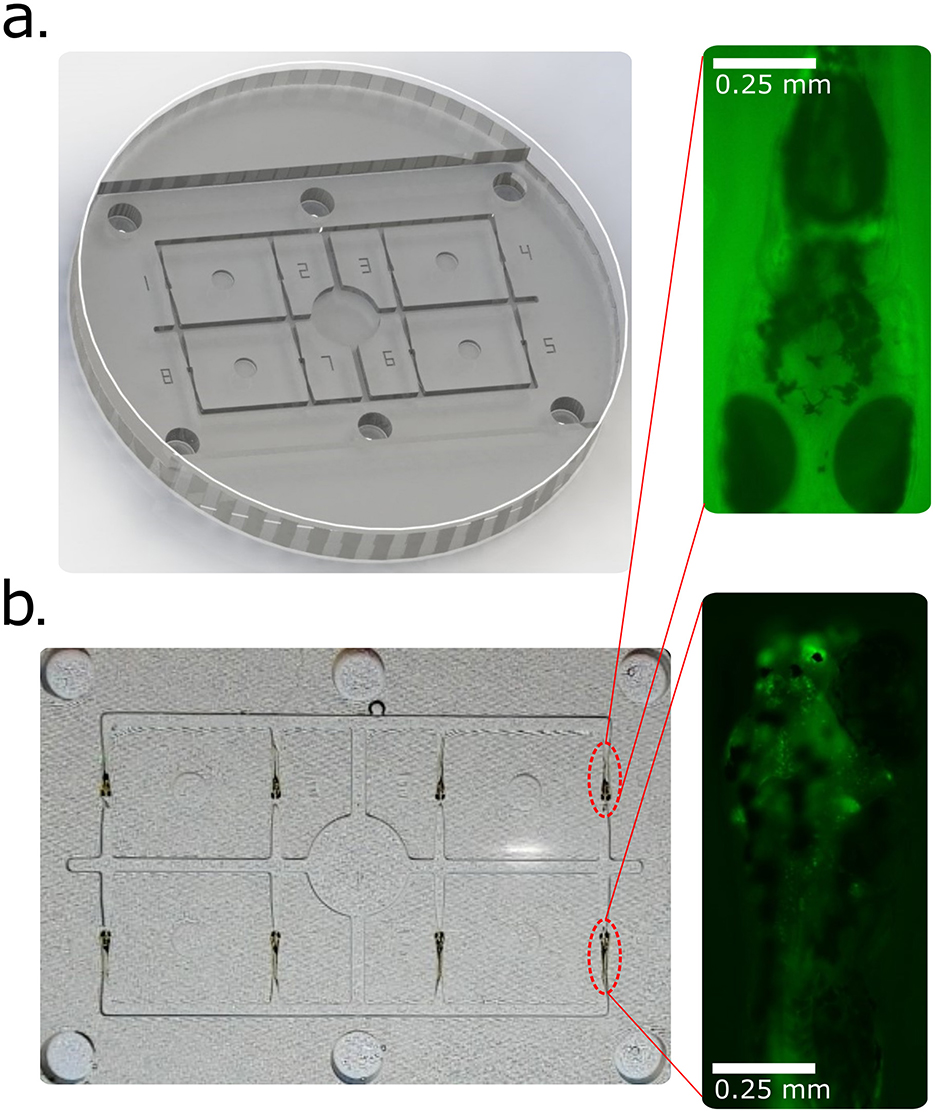 Figure 6. High-throughput screening of transgenic zebrafish larvae using the Agarose Stamped Device (ASD). (a) 3D-rendered CAD model of the zebrafish screening platform within a Petri dish, designed for parallel analysis of multiple larvae. The ASD facilitates rapid and reproducible positioning of larvae for fluorescence-based screening. (b) Screening of eight transgenic zebrafish larvae to distinguish fluorescently labeled individuals from non-expressing controls. The inset images highlight representative larvae: the upper inset shows a negative example (no detectable fluorescence), while the lower inset depicts a positive transgenic larva with fluorescent marker expression in motor neurons.