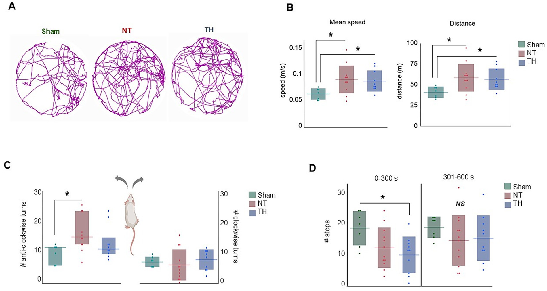 Figure 2. Open field exploration: (A) Representative track plots for each treatment group over the 10-min testing period. (B) Mean speed and distance were higher in injured animals compared to Sham rats. (C) NT rats made more anti-clockwise turns than Sham rats, whereas the number of anti-clockwise turns in TH rats was not different from either group. (D) The number of stops in the first 5-min half of exploration (0–300 s) was lower in TH-treated animals than Sham, while stops were not different among treatments in the second half of exploration (301–600 s). *p < 0.05 > 0.01. Floating horizontal bars represent means in (B,D), clockwise turns in (C), and medians in the anti-clockwise turns in (C). Shaded bars represent standard deviation in (B,D), and the clockwise turns in (C), and interquartile range in the anti-clockwise turns graph in (C). Dots represent individual rat values. Rat image in C created with BioRender (Saadat, 2025, q84v973, https://BioRender.com/).