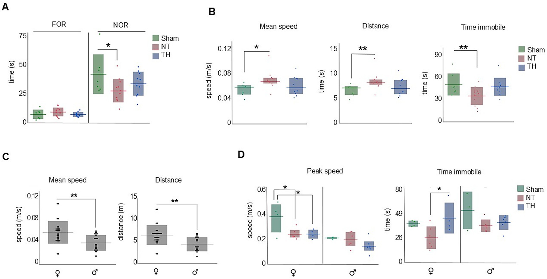 Figure 4. Novel object recognition (NOR). Non-spatial memory and measures of attention were impaired in NT but not TH rats. (A) NT rats spent less time with the familiar object than Sham rats. (B) NT but not TH rats moved faster, traveled farther, and spent less time immobile than Sham rats. (C) Female rats moved faster and traveled farther than male rats during the 2-min testing period. (D) Both NT and TH female rats moved with slower peak speeds than Sham female rats; TH female rats spent more time immobile than NT female rats. Horizontal lines represent mean (A,B) time immobile (C,D), or median [(B) speed and distance]. Shaded bars show the standard deviation (mean graphs) or interquartile range (median). Dots represent individual rat values. *p < 0.05; **p < 0.01.