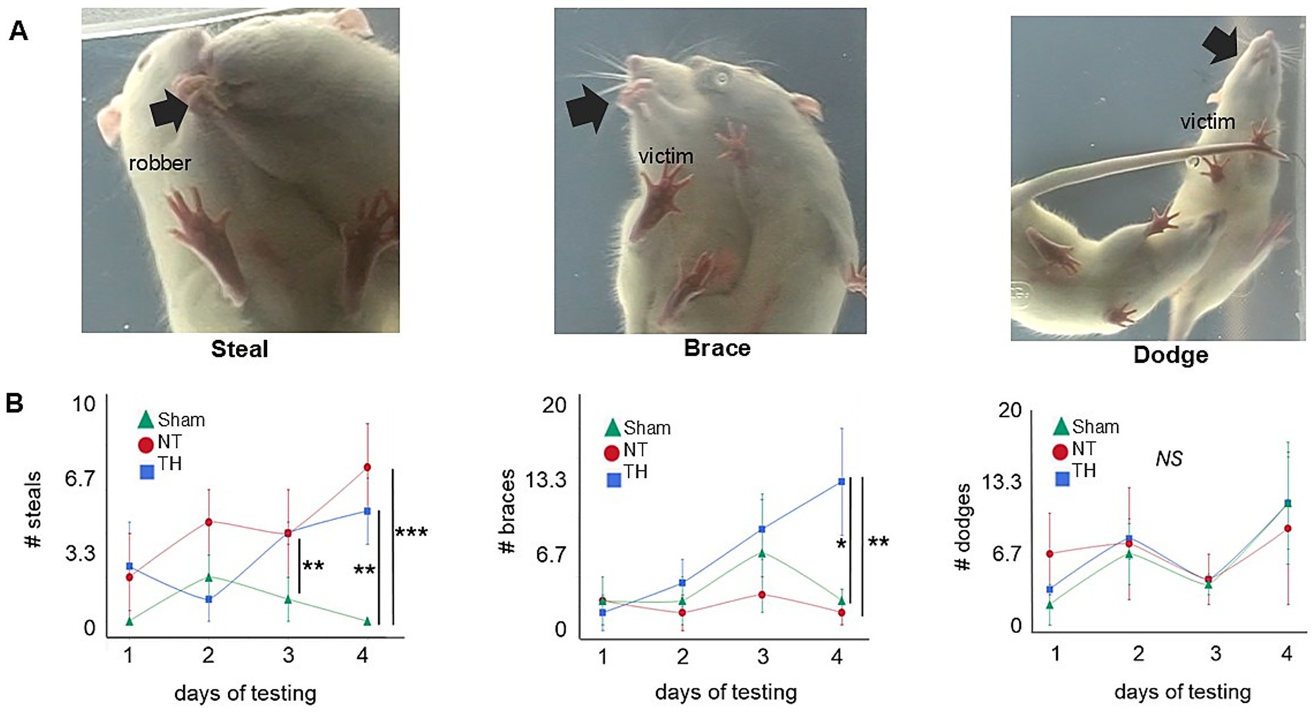 Figure 5. Food protection. (A) Video stills depict a representative (L–R) steal, brace, or dodge. The black arrow highlights the location of the food item: in a steal, the robber takes the item away from the victim rat; in a brace, the food item is braced with the victim’s forepaws as it turns away from the robber rat; and in dodge, the item is held in the victim rat’s mouth while all four paws are used to move away from the robber rat. (B) Number of each (L–R) steals, braces, and dodges over each of the four testing days (Greco et al., 2020; Thornton et al., 2017; Northington et al., 2011; Kebaya et al., 2023). Colored shapes indicate the median for each treatment group, and error bars represent the median absolute deviation. *p < 0.05; **p < 0.01; ***p < 0.001. The “**” symbol in day 3 steals refers to the significant difference between Sham and NT (p = 0.0100); the comparison between Sham and TH was not significant (p = 0.0569).