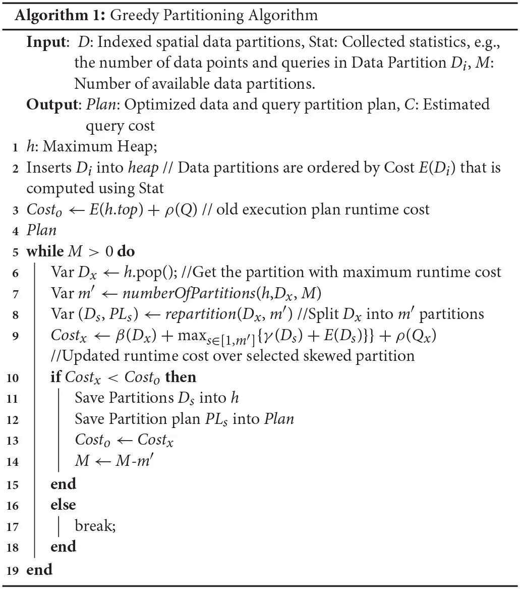 The general idea is to search for skewed partitions based on their local query execution times. Then, we split the selected data partitions only if the runtime can be improved. If the runtime cannot be improved, or if all the available data partitions are consumed, then the algorithm terminates. While this greedy algorithm cannot guarantee optimal query performance, our experiments show significant improvement (by one order of magnitude) over the plan executing on the original partitions. Algorithm 1 gives the pseudocode for the greedy partitioning procedure.