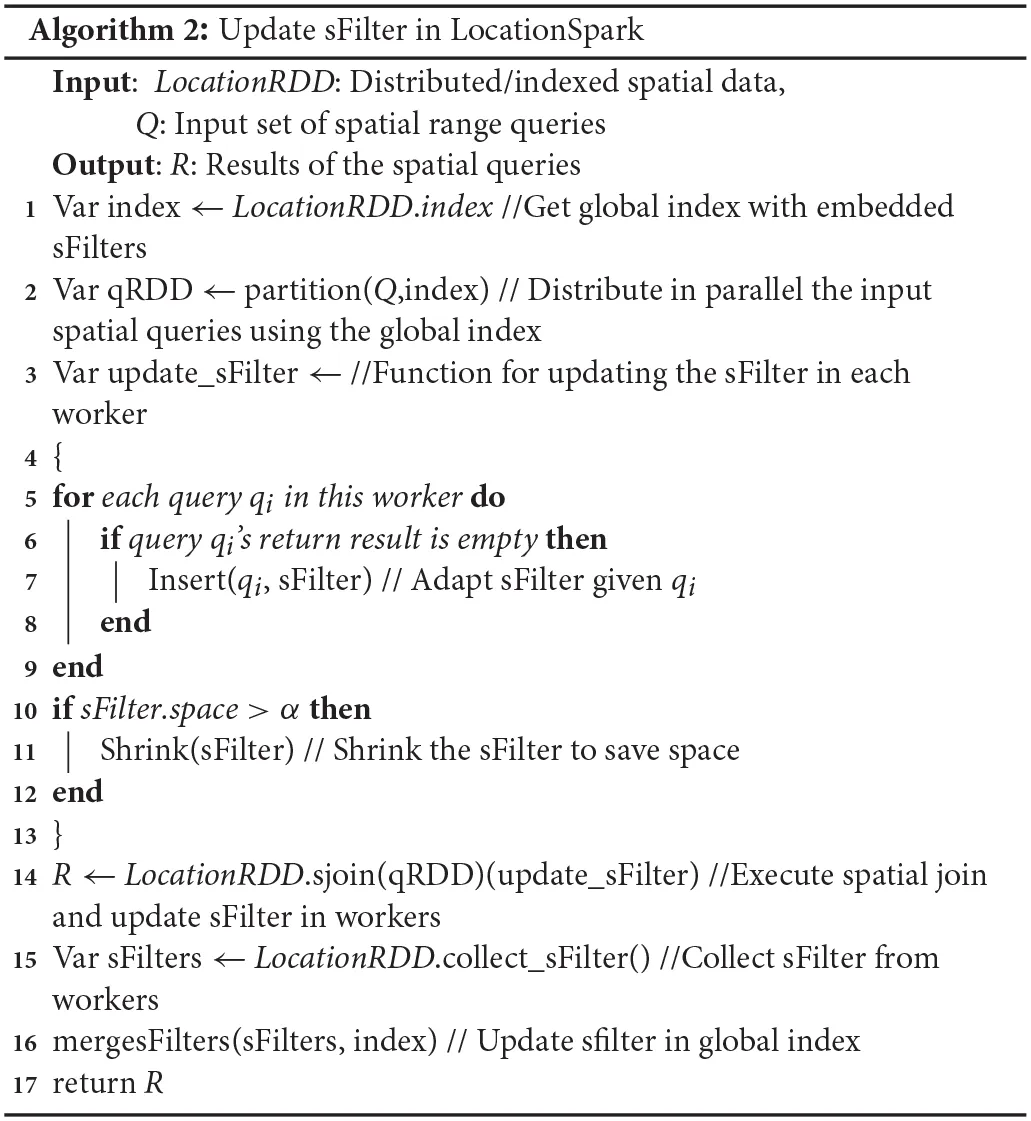 Algorithm 2 gives the procedure for performing the spatial range join using the sFilter. Initially, the outer (queries) table is partitioned according to the global index. The global index identifies the overlapping data partitions for each query q. Then, the sFilter tells which partitions contain data that overlap the query range (Line 2 of the algorithm). After performing the spatial range join (Line 14), the master node fetches the updated sFilter from each data worker, and refreshes the existing sFilters in the master node (Lines 15–16). Lines 2–13 update the sFilter of each worker (as in Figure 2).