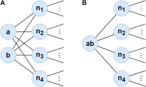 FIGURE 2. Example of graph compressing. (a,b) are merged into super-node ab connected to the neighbors of both (a,b).