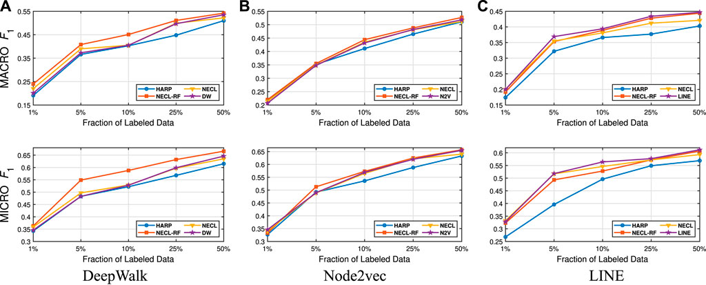 Detailed comparisons between all methods using different portions of labeled vertices as training data are presented in Figures 9–12. In most cases, we see that in most of the cases, NECL and NECL-RF give the highest accuracy compared to other models or give better results than the baseline models. We observe that, for some datasets, refinement decreases the accuracy of NECL. The reason for this decrease might be that, for some classification tasks, learning a global structure with compressed data, which also includes a local structure in the super-nodes, would be enough. So when we relearn and update the embedding of the compressed graph, it might add noise to the features. As a result, it deteriorates the accuracy of the classification task. Also, as we see from the figures, our method has a better improvement on DeepWalk. The reason is that while Node2vec and LINE may learn higher-order proximity, regular random walk in DeepWalk may not capture higher-order proximity, so it loses the global information. It also depends on the datasets.