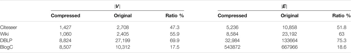 FIGURE 8. The ratio of vertices/edges of the compressed graphs to that of the original graphs. (Citeseer (A), Wiki (B), DBLP (C) and BlogCatalog (D)).