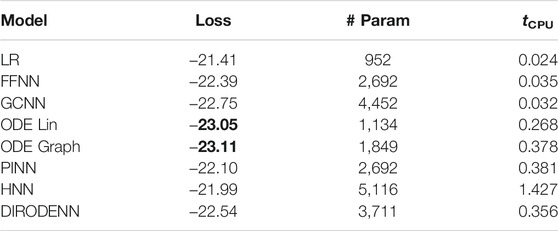 Normally (in the power system literature), the power network and line characteristics in Eq. 16 correspond to the actual physical lines; then line parameters, m, d, are dynamic physical parameters associated with devices’ (generators and loads) inertia and damping (also frequency control), respectively, while β, g are static physical parameters of the respective lines and devices. Here, we adapt this physical picture to a reduced model of power systems. This adaptation is obviously blurred by limited observability. We assume, extending the static consideration of the study by (Pagnier and Chertkov, 2021), that Eq. 16 also applies to a reduced set of nodes where the PMU devices are located and measurements are available. In this setting, we consider a complete graph that connected the observed nodes and do not assume that the (effective) nodal and line parameters are known—instead we aim to learn the effective parameters. It should also be noticed that Eq. 16 can be viewed as a particular, that is, more structured, version of the port-Hamiltonian system of Eq. 15. Here, like in the case of Path-HNN, we introduce the direct ODE NN (DIRODENN) version of the Path-Neural ODE, substituting Path-NeuralODEϕ in Eq. 11 by Path-DIRODENNϕ, and then train it by minimizing Eq. 12 where the respective substitution is also made.
