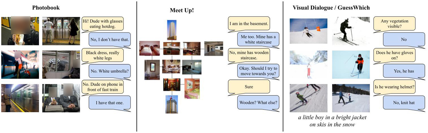 Visual Dialogues have a long tradition (e.g., Anderson et al., 1991). They can be chit-chat (e.g., Das et al., 2017) or task-oriented (e.g., de Vries et al., 2017; Haber et al., 2019; Ilinykh et al., 2019a,b). Task-oriented dialogues are easier to evaluate since their performance can be judged in terms of their task-success, hence we focus on this type of dialogues which can be further divided as following: the two agents can have access to the same visual information (de Vries et al., 2017), share only part of it Haber et al. (2019) and Ilinykh et al. (2019a) or only one agent has access to the image (Chattopadhyay et al., 2017). Moreover, dialogues can be symmetric (Haber et al., 2019), or asymetric, with one agent asking questions and the other answering it de Vries et al. (2017), Das et al. (2017), and Chattopadhyay et al. (2017). Finally, the dialogue turns can contain different speech acts (Haber et al., 2019; Ilinykh et al., 2019a,b) or only question anwer pairs (Chattopadhyay et al., 2017; Das et al., 2017; de Vries et al., 2017). The differences between the various type of dialogues are illustrated in Figure 1. As we can see symmetric games with partially observable data (PhotoBook and Meet up! Haber et al., 2019; Ilinykh et al., 2019a) sollicitate more complex exchanges than symmetric ones (Visual Dialogue, GuessWhich—the referentional game built from it Chattopadhyay et al., 2017; Das et al., 2017, and GuessWhat?! de Vries et al., 2017—the latter is illustrated in Figure 2). Given the difficulty negation poses to models, we take the scenario which is less complex from a dialogue perspective and in which questions are always grounded in the image: the one in which agents have access to the same visual information, only one agent can ask questions, and the questions are all of the same type. Hence, we take GuessWhat?! as case-study and focus on the referential grounded guessing task: a Guesser receives an asymmetric dialogue, consisting of Yes/No-questions over an image, a list of candidates and has to guess the target object the dialogue is about. In this setting, negation is heavily present as the answer to a binary question. As such it functions as a pointer to the alternative set of the negated expression; in other words it should be interpreted as pointing to the set of all the candidates objects which do not have the queried property.