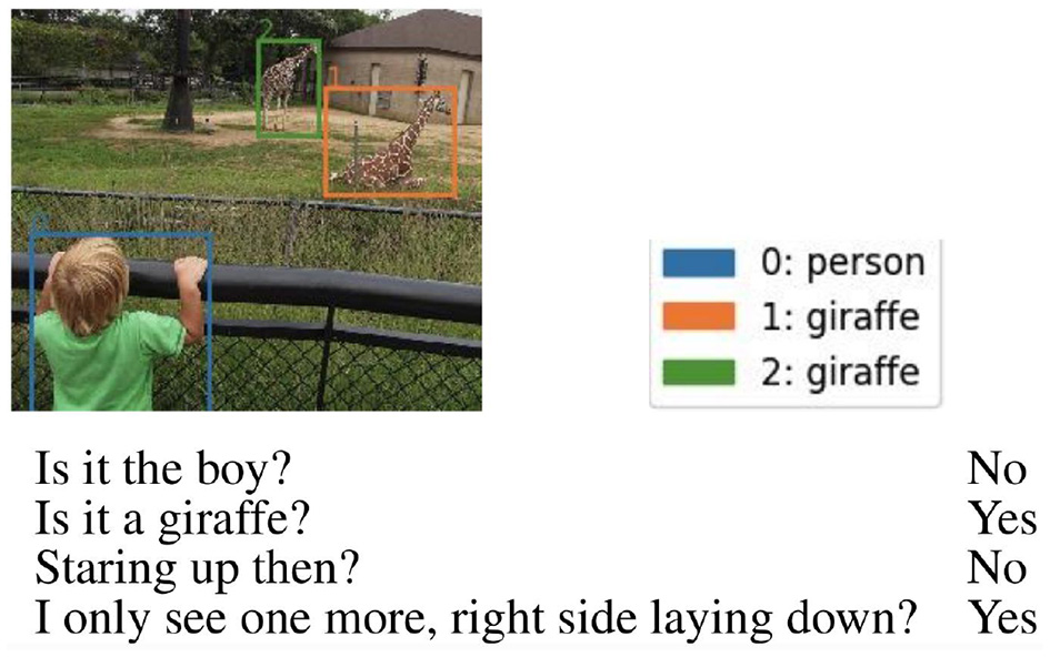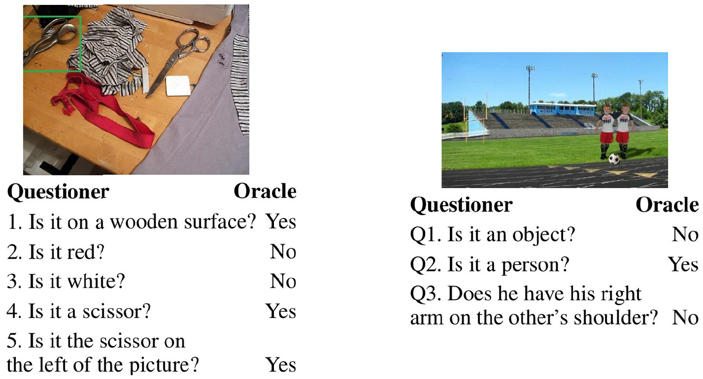 GuessWhat?! (de Vries et al., 2017) is an asymmetrical game involving two participants who see a real-world image. One of the participants (the Oracle) is assigned a target object in the image and the other participant (the Questioner) has to guess it by asking Yes/No questions to the Oracle. de Vries et al. (2017) collected a human dialogue dataset via Amazon Mechanical Turk. Our focus is on multimodal encoding, hence we focus on the guessing task: given a human dialogue, consisting of Yes/No questions and their answers, an image and a list of possible candidate objects, the agent has to select the object the dialogue is about. Greco et al. (2020) have shown that human dialogue length is a good proxy of the guessing task difficulty2, where length is measured in terms of number of turns; for instance in Figure 2 the dialogue on the left is of length 5 (it consists of five turns) whereas the one on the right is of length 3. In the following, we use “turn” to refer to the position (of just the question or the answer or of the QA pair) within the dialogue.