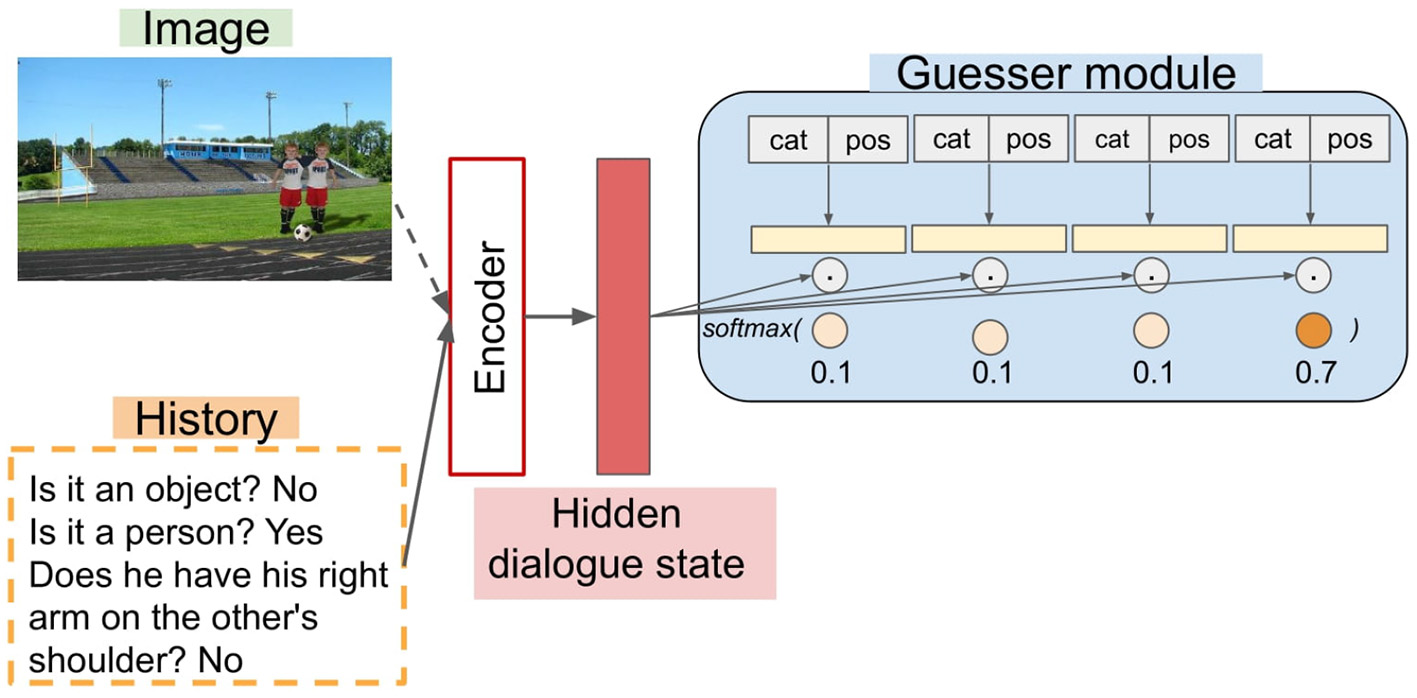 Shared Encoder-Guesser skeleton. The Guesser receives the category labels (e.g., “bottle”) and the spatial coordinates (pos) of each candidate object. Multimodal encoders receive both the image and the dialogue history, whereas blind models receive only the latter.