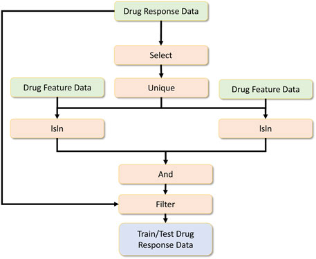 Once the drug response data, drug feature data and RNA-sequence data are preprocessed, the final data for the drug response model is engineered as shown in Figure 11. The processed drug response data are further feature-selected, and a unique operation is applied. Then the RNA sequence data is filtered by checking whether specific drug-related RNA sequences are present. The same is done for the drug feature dataset. These two operations are done by the isin operator. Afterwards, the common drug set is selected by performing an and operation, and later these common drug-related drug response data filters are used to get the final drug response data.