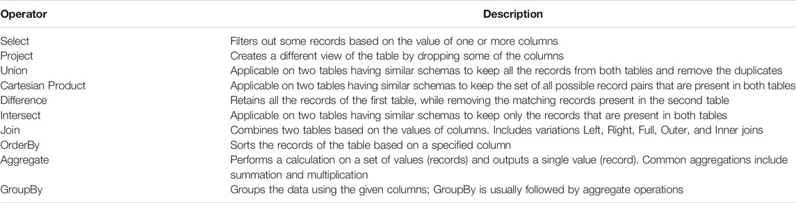 There are thousands of operators defined for arrays, tensors, tables, and matrices. Note that tensors are similar to arrays but have an important deep learning utility. Matrices are similar to arrays and tensors but typically two dimensional. Tables (and dataframes) are characterized by entries of heterogeneous types. This is widely used in databases where the different columns can have strings to dates to numbers. Table 1 shows some common operator categories for tensors as defined by PyTorch, Tensorflow or Keras. These deep learning frameworks define over 700 operators on tensors. Numpy lists 1085 array operations. Table 2 shows some of the popular operations on tables, where the Python Pandas library has around 224 dataframe operators out of a listed total of 4782. Also, optimized linear algebra operators are used internally in most widely used math and tensor compute libraries. Table 3 contains a classification of BLAS operators, which are local or distributed. The (old but standard) library SCALAPACK has 320 functions (operators) at a given precision and a total of over one thousand.
