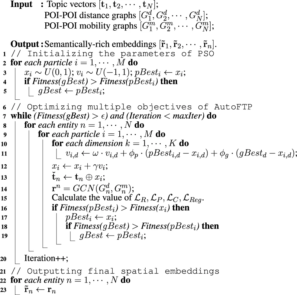 To claim AutoFTP clearly, we provide the pseudo-code of the learning process of AutoFTP. As illustrated in Algorithm 1, the framework includes three steps: (i) initializing the parameters of PSO, (ii) optimizing multiple objectives of AutoFTP, (iii) and outputting the final spatial embeddings. The framework takes topic vectors, POI-POI distance graphs, and POI-POI mobility graphs of spatial entities as input, and final semantically-rich embeddings as output.