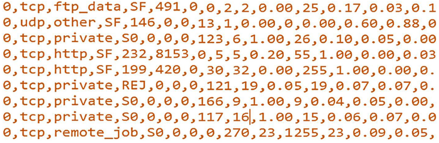 Like image recognition, in cybersecurity, more than 99% of new threats and malware are actually very small mutations of previously existing ones (Tavallaee et al., 2009). Indeed, cyberattacks/malware are also software, so they can also exhibit biological behavior as propagate, mutate, and replicate. This means that the newly developed cyberattacks are usually made by slightly changing the earlier known cyberattacks at very specific and minimal parts of the attack file/header, for instance, changing few bits of the attack/malware file. For example, Figure 1 shows sample records of the original NSL-KDD training dataset in the. csv format but read by Notepad in .txt format (prior to any processing technique). These samples are all classified as anomaly traffic records (the first feature corresponds to the class label, i.e., normal: 0 and anomaly: 1). One can mutate few bits of the depicted features to produce new anomaly traffic with new effect. This changing in the those few bits is termed as bit mutation. Therefore, traditional machine learning techniques have great difficulty in detecting a large portion of this new malware (newly mutated attacks).