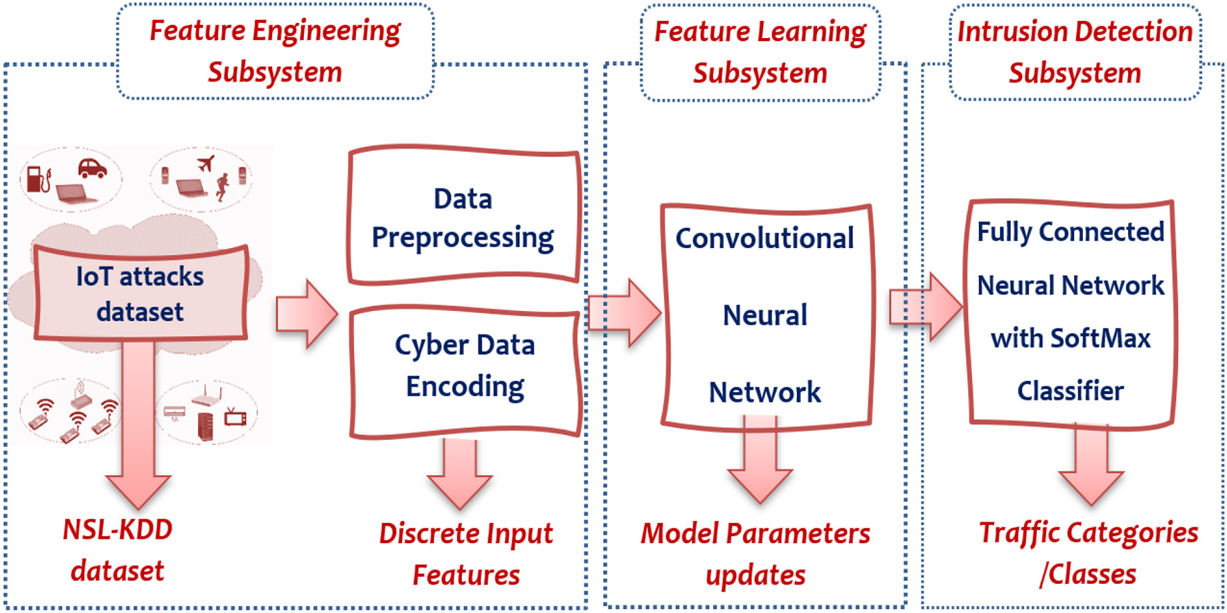 We provide an illustrated description of our system's architecture modules and the machine learning algorithms demonstrating a comprehensive view of the computation process of our IoT-IDCS-CNN.