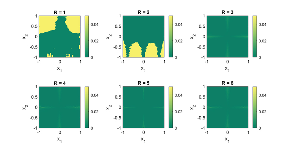 The function (Equation 19) has a kink on the lines x1 = 0 and x2 = 0 which is caused by the first separable term |x1||x2|. Despite of its nonsmooth features, it is still of low rank, particularly R = 3. Subsequently, Equation (19) can be well approximated with terms using Equation (8), instead of the terms needed with Equation (5). In Figure 2 we actually demonstrate this numerically. The figure contains a plot of the absolute error between the obtained approximant (Equation 8) by solving (Equation 9) using the GN algorithm with random initialization and the true function (Equation 19). For our experiment, we took 8,000 random samples of the function uniformly over the domain for our training set. For each of the component functions (Equation 7), we chose a uniform knot distribution with M = 31 and N = 4. From the plots, one can clearly see that the first two low-rank approximations (i.e., R = 1, and R = 2) are of poor quality. This is expected, since a rank-one or a rank-two approximation cannot capture the full complexity of the function. In fact, the results will not even improve if more data samples are taken and the number of knots are increased for each of the component functions (Equation 7). The rank-three approximation is on the other hand of significantly better quality. This is expected because the true function (Equation 19) also contains three separable terms. Furthermore, the higher-rank approximations with R > 3 do not seem to add much value to the approximation. This also exhibits the property that the rank can be overestimated without loss in quality.