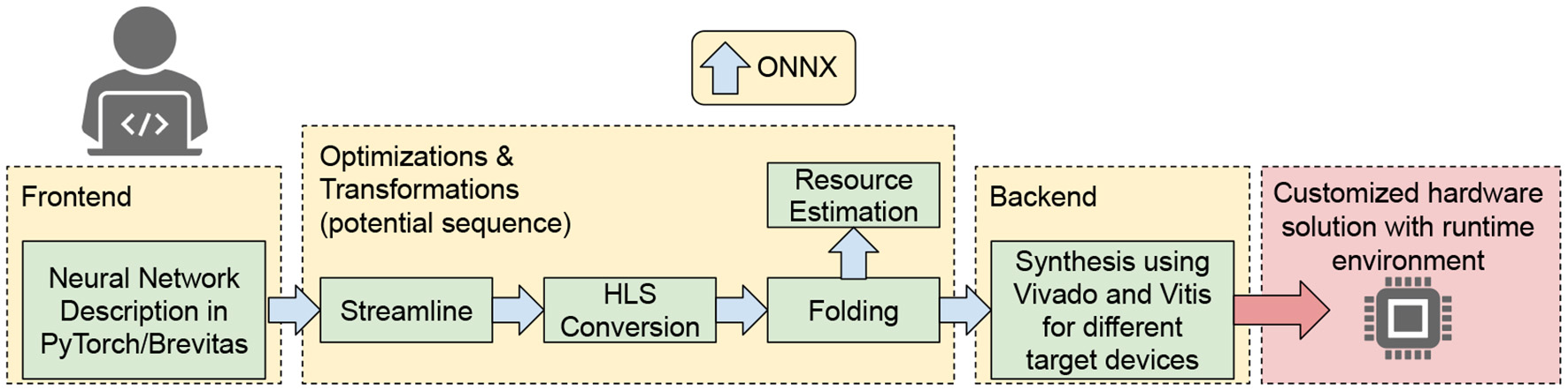 The hls4ml library (Duarte et al., 2018; Coelho et al., 2020; Loncar et al., 2020; Aarrestad et al., 2021) converts pre-trained ML models into ultra low-latency FPGA or ASIC firmware with little overhead required. Integration with the Google QKeras library (Coelho, 2019) allows users to design aggressively quantized deep neural networks and train them quantization-aware (Coelho et al., 2020) down to 1 or 2 bits for weights and activations (Loncar et al., 2020). This step results in highly resource-efficient equivalents of the original model, sacrificing little to no accuracy in the process. The goal of this joint package is to provide a simple two-step approach going from a pre-trained floating point model to FPGA firmware. The hls4ml library currently provides support for several commonly used neural network layers like fully connected, convolutional, batch normalization, pooling, as well as several activation functions. These implementations are already sufficient to provide support for the most common architectures envisioned for deployment at L1.