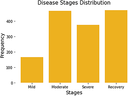 Since each patient may be recorded multiple times, the stage of disease may be different from one recording period to the next. For example, some patients who were mild patients at the beginning of the record may become severe patients a week later. So, in the task of predicting the stage of disease, we remove the user code and predict the disease status for each record. All patients have a total of 1,480 complete records. Each record will be associated with a label by a survey from Welltory, identifying the corresponding patient's current stage. Figure 1 summarizes the number of stages per disease stage category.