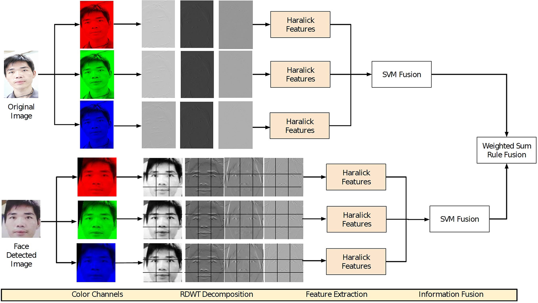 Haralick features obtained from each subband and original face are concatenated and input to a linear Support Vector Machine (SVM) classifier for classification,