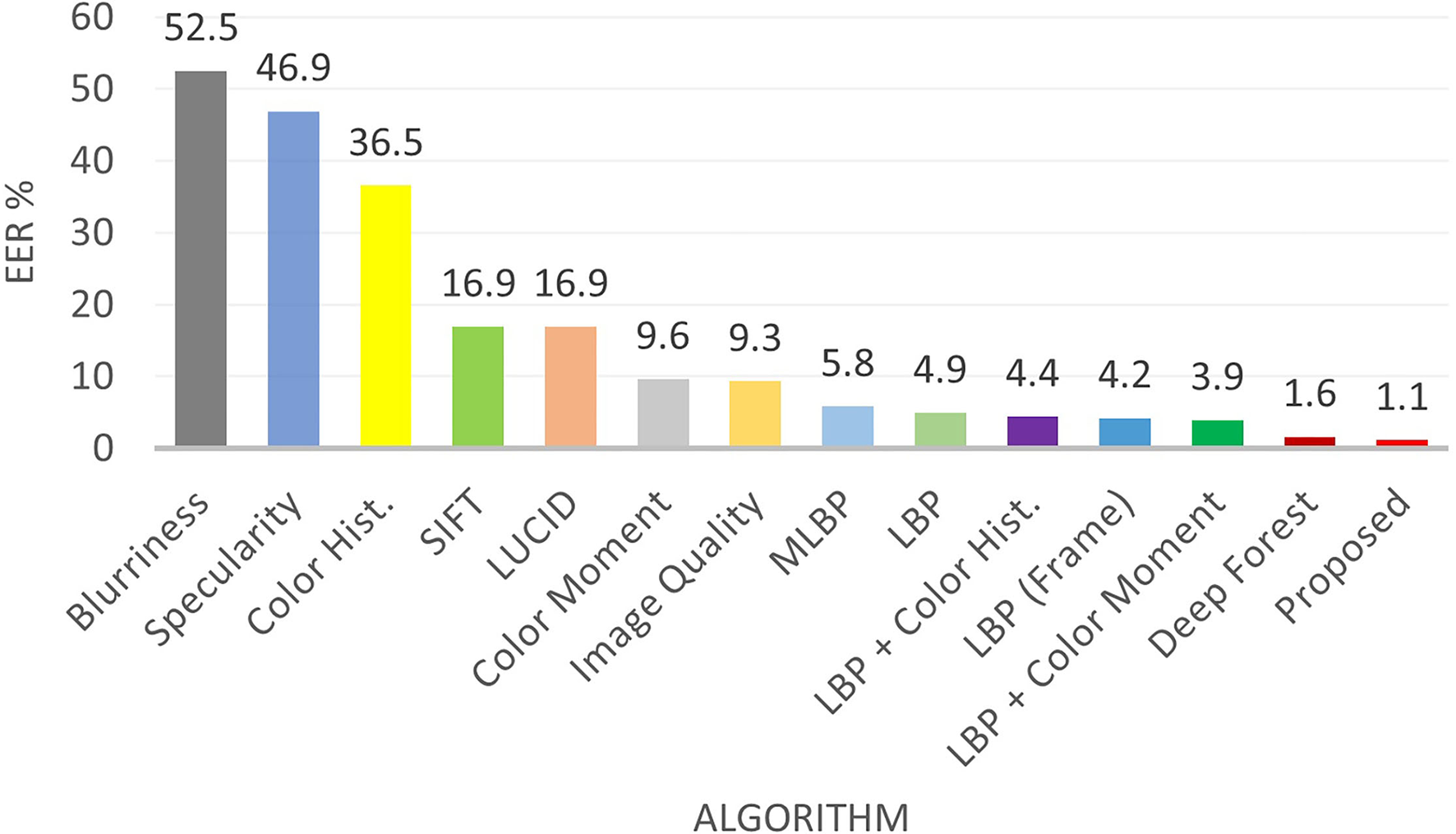 The results for individual spectrum experiments are summarized in Table 3. The proposed algorithm achieves 0% ACER and BPCER in both the spectrums which shows the consistency of the algorithm across spectrums. The second best performing algorithm is by Raghavendra et al. (2016) (LaMTiF) and it achieves 0.74% and 2.08% ACER in NIR and VIS spectrum, respectively. LaMTiF uses a combination of Laplacian pyramid based decomposition to extract the high-frequency information and Short Term Fourier Transform (STFT) for time and frequency features. The limitation of the LaMTiF algorithm is the high error rate for attack detection. Table 3 also shows the results of several other texture based algorithms and it can be observed that the algorithms are generally ineffective in detecting either the bonafide presentation or attack presentation. The proposed algorithm is robust to both kinds of data, which is desired and required for real-world presentation attack detection algorithms integrated with face recognition systems. The misclassification of bonafide data as attack data can frustrate the genuine user because of the need to give face data again and again for recognition. At the same time allowing attack data as bonafide data can cause serious harm to the face recognition system. The proposed algorithm yields the best EER (i.e., 0%) on the MSSPOOF database.