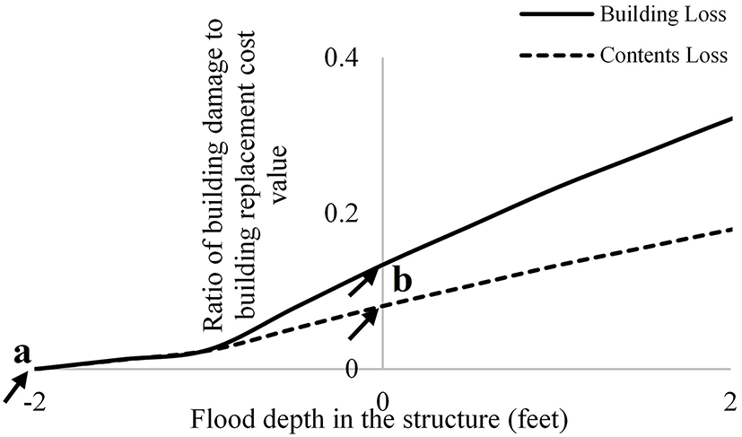 The dh is an important parameter for all flood loss models (Apel et al., 2009), in part because it is used in the DDFs to estimate building loss (LB) and contents losses (LC); and therefore total AAL (Pistrika et al., 2014). More recent research has highlighted the importance of dh where damage is assumed to initiate. Gnan et al. (2022a) demonstrated that AAL derived from USACE functions that initiate damage at a dh of −2 feet (i.e., 2 feet below the top of the first floor) were much higher than AAL calculated from the same function with damage initiation assumed to occur at dh = 0 (i.e., top of first floor; Figure 2). Consideration of flood risk reduction through optimal home elevation and the sensitivity of risk assessment to DDF selection remain as fundamental issues in the development of consistent flood risk assessment procedures.