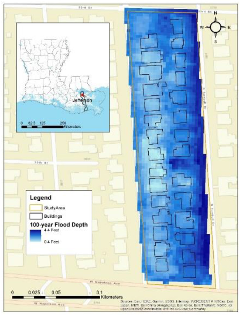 Several criteria should be met by the case study selected in order to address the research questions most effectively. The selected area should be subjected to flooding and be densely populated, so that flood impacts are detectable. Availability of high-quality flood hazard data at multiple return periods and building data for each home in the study area is also essential. The study area should also be sufficiently large and diverse to allow for meaningful calculations and transferability of results elsewhere, yet small enough to ensure uniformity in flood hazard, which promotes improved generalizability of FFH results across space.