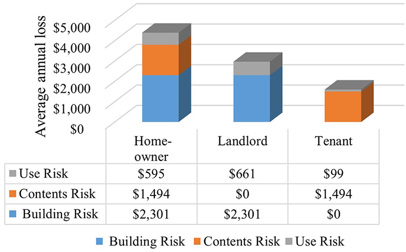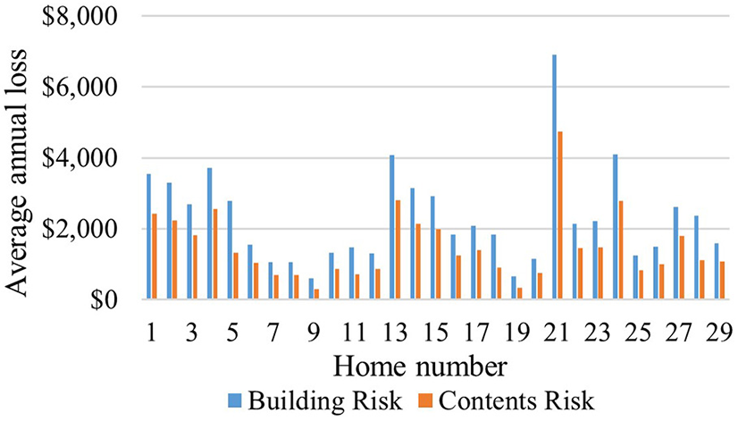 The wide variation in AAL across the case study area, with homes 21 and 9 having the highest and lowest AALB$ and AALC$ (Figure 4), demonstrates the value of performing neighborhood-level risk assessment. Many factors affect AAL results. Further analysis to interpret the results presented in Supplementary Table 6 demonstrates that unique DDFs based on number of stories result in statistically significant differences in AALC$ to AALB$ ratios (p-value of 0.0004), with mean values of 67 and 49% for one- and two-story homes, respectively. Other factors, such as a and u parameters, FFH0, and VR also affect AAL (Table 2). The finding that AALT$ for homeowner-occupied homes exceeds that for the other owner/occupant types (Figure 5) is reasonable because the homeowner bears the risk for building, contents, and use, while the smallest AALT$ is borne by tenants because they incur no AALB$.