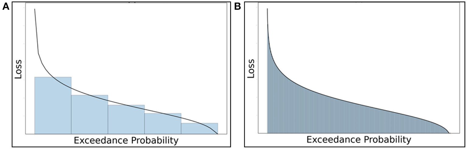 Figure 7. Comparison of coarseness using the Riemann sum approach: (A) coarse trapezoidal areas under the loss-exceedance probability curve in the Hazus-MH approach vs. (B) fine trapezoids used in the proposed AAL approach.