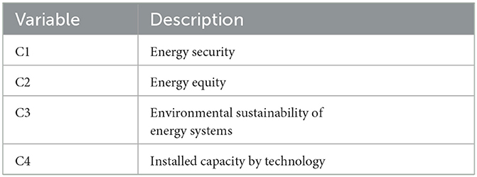 For the evaluation variables of the environmental conditions, the rating of the energy trilemma index is taken, in each of its dimensions. This has a percentage weighting that can also be projected to values between zero (0) and one (1), with zero (0) corresponding to 0% and one (1) to 100%. The variable installed capacity by technology is included in these dimensions, to incorporate the diversity of the energy resource in the analysis, with values between zero (0) and one (1). Where zero (0) indicates that there is no installed capacity of a certain technology and one (1) represents the use of a single technology to cover the total energy requirement. The variables considered for the evaluation of environmental conditions in the fuzzy model are presented in Table 2.