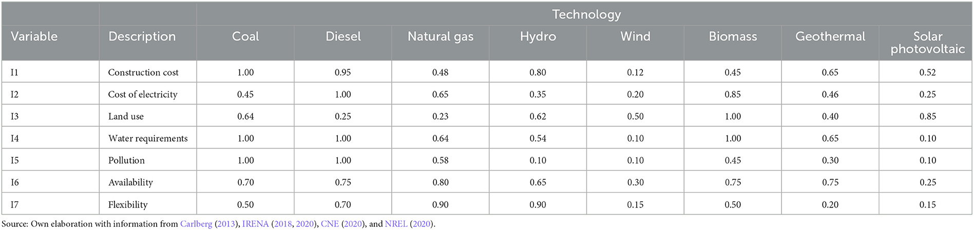 In this aspect, the available electricity generation technologies are considered, with the characteristics developed in the literature (IRENA, 2018, 2020; CNE, 2020; NREL, 2020). The values are weighted according to the maximums in each variable and, based on what is presented in Figure 2, the values not available in the references are estimated, under the following considerations: