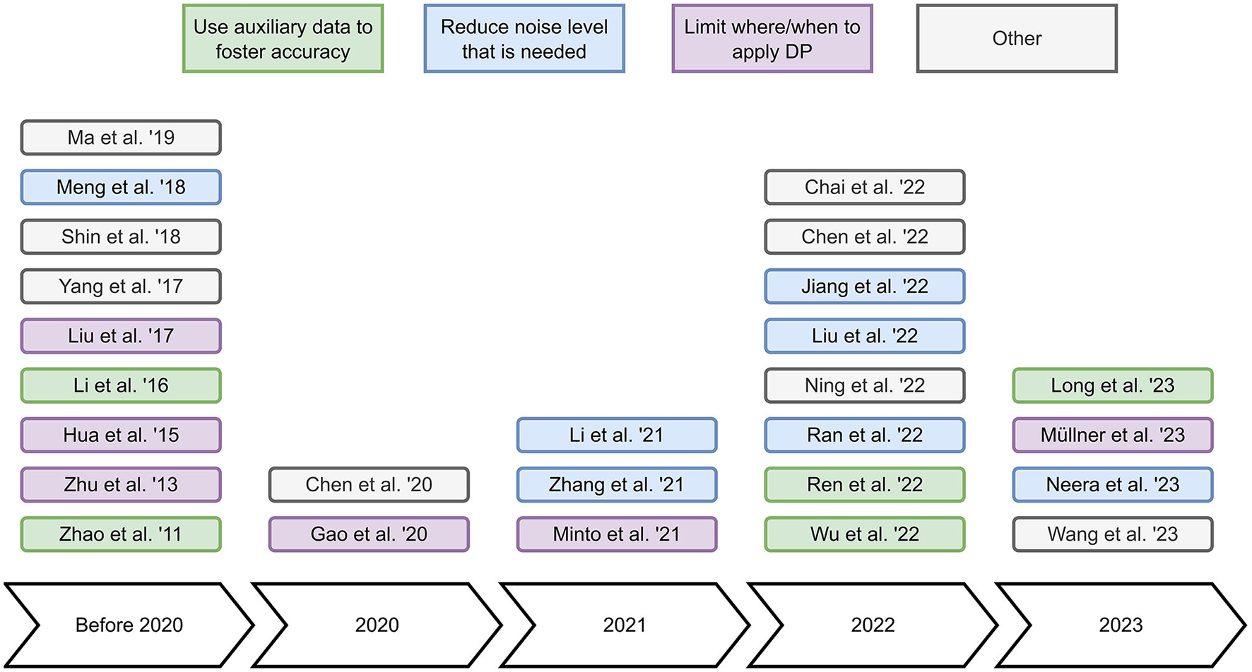 Overview of the main concepts of the reviewed papers. Use auxiliary data to foster accuracy refers to the incorporation of data from other domains, datasets or users to increase recommendation accuracy. Reduce noise level that is needed refers to designing recommender systems that require a minimal amount of noise to ensure DP. Limit where/when to apply DP refers to carefully minimizing the application of DP. Other refers to approaches that do not fit into the previous categories.