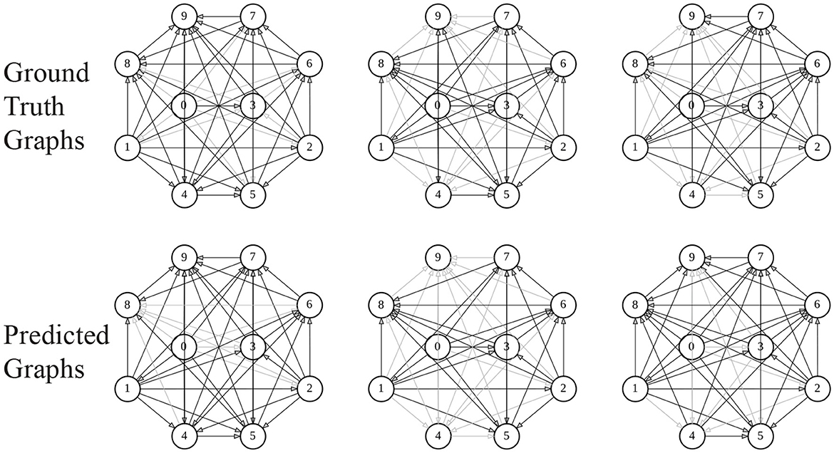 Table 1 summarizes the results of all the models on all the datasets. We observed that AD-ESN achieves overall the best performance on all five datasets with different data scales and underlying priors, which indicates the exceptional adaptability of AD-ESN over the baselines. Specifically, AD-ESN surpasses ESN in all tasks, highlighting the efficacy of neural architecture searches. Some of the baseline models can perform well on a restricted set of tasks but fall short on others, which means they are much more sensitive to datasets. For simulated coupled oscillator data, we first tested all the methods on a sampled dataset with the same initialization circumstances as NRI (Syn-Coupled-1) (Kipf et al., 2018), then another dataset with a different configuration (Syn-Coupled-2). It can be seen that NRI and dNRI perform better than AD-ESN on Syn-Coupled-1 but fails miserably on Syn-Coupled-2 when the hyperparameters are not fine-tuned. Our proposed AD-ESN architecture, on the other hand, performs slightly worse than NRI and dNRI on Syn-Coupled-1 but significantly better than all the rest comparison approaches. This serves as a noteworthy illustration showcasing both the capabilities and limitations of our proposed AD-ESN framework. In the case of a dataset such as Syn-Coupled-1, for which existing methods (e.g., NRI) have been specifically designed and optimized, AD-ESN may not necessarily surpass these established methods. Nevertheless, its notable strength lies in its adaptability across a diverse array of datasets, consistently delivering satisfactory performance even when other methods prove ineffective. On the remaining datasets, our proposed AD-ESN consistently outperforms the other methods. Only two of the ESN-based algorithms are scalable to be trained on the Brain dataset since the time-series of nodes are excessively long. The predicted graphs using AD-ESN are compared to the ground truth graphs from the Syn-Chaotic dataset in Figure 3. The adaptability of AD-ESN is enabled by the proposed deep-echo-state graph dynamics encoder which is automatically altered with NAS in a self-supervised manner.