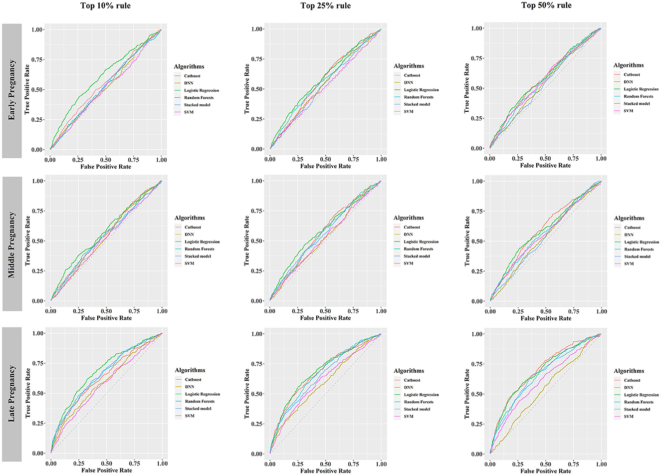 Figure 3. Bar plots comparing area under the receiver operating characteristic curve (AUC) values across all prediction models stratified by different rules for selecting the number of predictors and pregnancy intervals. (A) Early pregnancy, (B) Middle pregnancy, (C) Late pregnancy. The horizontal red dotted line indicates an AUC value of 0.5.