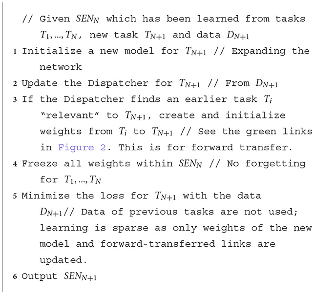 Figure 2 illustrates how SEN is expanded and learned with the new tasks without forgetting previous tasks. The pseudo-code in Algorithm 1 describes how to learn a new task TN+1 in the SEN framework after previous tasks T1, ...TN have been learned.