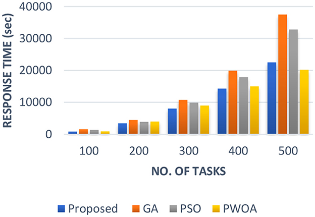 Therefore, GA-PSO is the most efficient algorithm in terms of execution time, response time and completion time, followed by PSO, Hybrid PWOA and GA is the least efficient algorithm.