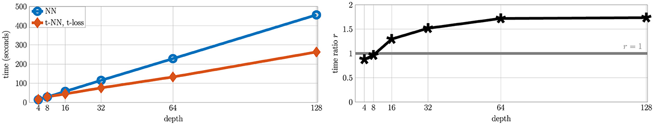 Figure 12. (Left) Average time per epoch to train a Hamiltonian network for a fixed batch size. We ran each depth for five epochs and the maximum standard deviation of time was on the order of 10−2 relative to the average time. (Right) Time ratio average r = NN epoch/t-NN epoch. As the depth of the network grows, the time per epoch for NNs takes almost 1.75 times longer than for t-NNs.