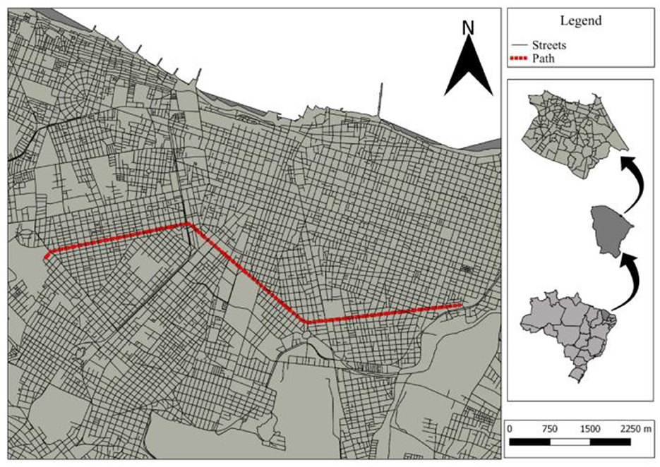 The experiments performed in this work took place in Fortaleza city, Ceará, Brazil. To verify the characteristics of the roads that influence the dynamics of pollutant emissions, the Law of Land Use and Occupancy of Fortaleza was used to determine the region where the experiment would be performed (Fortaleza, 2012). Arterial and collector roads were chosen, in which passenger flows predominate and serve large displacements along the road and connect local roads to arterial roads, respectively. The selection of the roads under study considered the following criteria: same number of lanes, tracks, and presence of a median; same direction and geographical orientation in the city; same road classification; same maximum allowed speed; similar lengths; differences between residential and commercial land use; the presence of commercial activities. The study area consists of a stretch of ~17 km among the three roads and in both directions (West-East and East-West), located in the urban perimeter of Fortaleza city. The route is composed of three ample avenues, classified as a collector, Avenida Jovita Feitosa, and arterial type I, Avenues Treze de Maio and Pontes Vieira. A more residential area surrounds the collector road and the arterial roads are characterized by a higher concentration of commercial businesses, whose traffic volumes between these two roads are similar. Figure 1 shows the complete route, both in the West-East (outbound) and East-West (return) directions. All streets have a maximum allowed speed limit of 60 km/h, and Table 1 presents the selected streets and their characterization according to the criteria listed above.