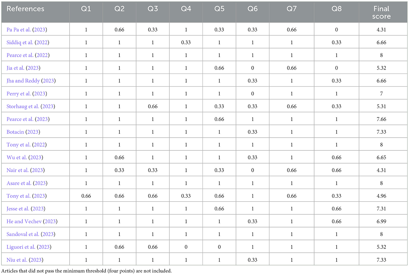 The quality check discarded three papers, which left us with 19 as a final sample, as seen in Table 9. The first article published in this sample was in 2022 and the number of publications has been increasing every year. This situation is not surprising, as generative AI has risen in popularity in 2020 and has expanded into widespread knowledge with the release of ChatGPT 3.5.