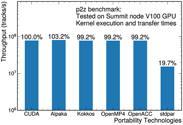 Figure 3 shows the throughput of the p2z implementations on the NVIDIA V100 GPUs, this time including both the kernel execution time and the memory transfer times. The transfer times are generally 2 to 5 times larger then the kernel execution times, which means that much of the variability between implementations is concealed. With the exception of stdpar, all implementations have close to identical performance because they provide memory management features to facilitate explicit data transfers, and in some cases memory prepinning as discussed in Section 5.1.2.