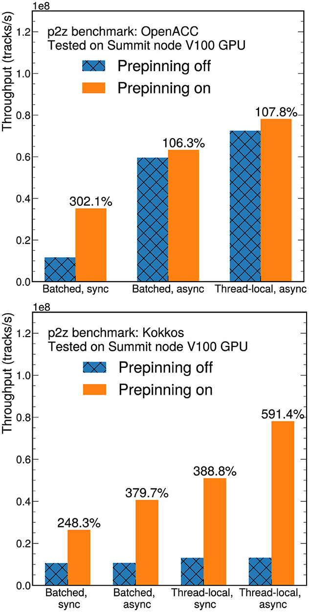 Figure 5. Throughput comparison on a V100 GPU showing the effect of turning memory prepinning on or off for different OpenACC (top) and Kokkos implementations (bottom) of the p2z benchmark: batch shared memory with synchronous or asynchronous transfers, and thread-private data on local memory with synchronous or asynchronous transfers. Measurements include both kernel execution time and data transfer times. The percentages in the figure refer to the throughput with memory prepinning on compared to the corresponding non-prepinned version.