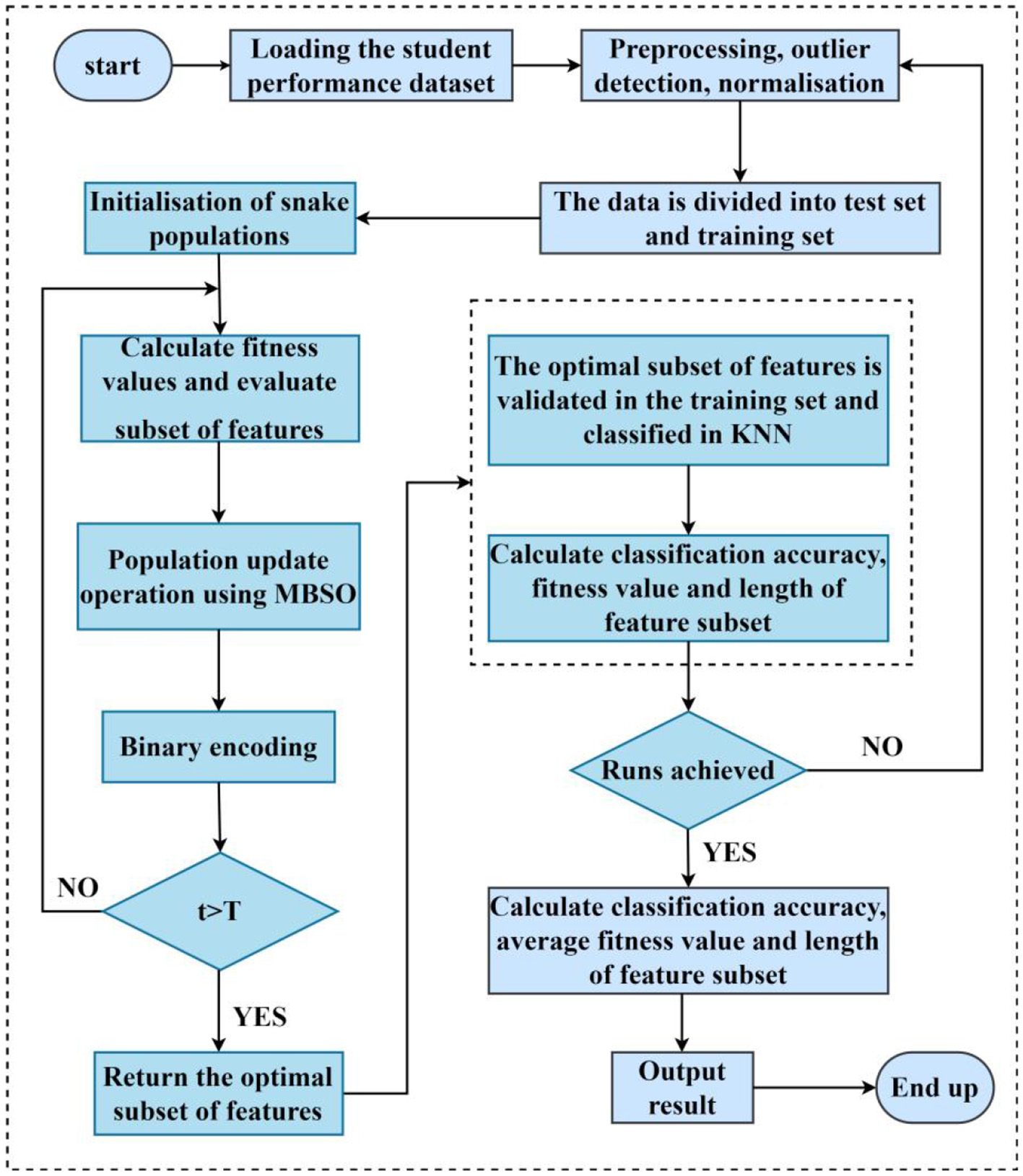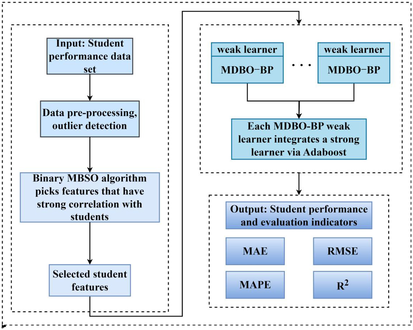 Yang and Li (2018) collected student educational data from 60 high schools and used Backpropagation (BP) neural networks as classification methods to predict student performance; the study showed that BP neural networks could correctly predict student performance. Shreem et al. (2022) proposed an Enhanced binary genetic algorithm (EBGA) as a wrapper selection algorithm and used five different classifiers to classify students' grades, and all of the classifiers yielded performance improvements between 1% and 10%. Yuan et al. (2024) proposed an integrated framework that combines learning behavior analysis and ML algorithms, which identifies different learning patterns of students by employing cluster analysis and uses ML algorithms to predict the performance in each pattern, and the results show that the integrated framework has a good predictive performance for the performance in the student's patterns. Bharara et al. (2018) used K-means clustering to extract the features that were most relevant to students and captured the hidden correlations between these features to improve the overall performance of the students. Turabieh et al. (2021) proposed an improved Harris hawk optimization (HHO) algorithm for discovering the most valuable features in the student performance prediction problem and used a combination of the improved HHO algorithm and a Layered recurrent neural network (LRNN) to attain 92% accuracy. Akour et al. (2020) used a model to predict the validity of student grades, which contribute to when a student will be able to complete a degree. Babu et al. (2023) used the monarch Butterfly optimization algorithm (BOA) to select features with high relevance, low complexity, and good student performance and then used Sailfish optimization (SFO) to optimize the coherence parameters of a Stacked sparse autoencoder (SSAE). Experimental tests demonstrated the effectiveness of the suggested classification model in terms of predicting students' performance, with an accuracy of 96.49%. Christou et al. (2023) wanted to predict the future performance and study time of the students by using the data from the past courses, thus collecting the data from the students in chemistry, mathematics, primary education history, philosophy and physics at the University, and proposing the FSC4RBF model for predicting the future performance of the students as well as the study time in the middle of each year, and all the experiments with regression and classification problems have yielded the best results. Asselman et al. (2023) proposes a Performance factor analysis (PFA) method based on XGBoost so as to improve the student performance prediction. It is evaluated on three student datasets, and the prediction performance is improved with the original (PFA). Although a wide range of researchers have made many contributions to big data education, it is still difficult to accurately select data features that have strong relevance to students, and the current methods achieve low classification and prediction accuracies. At the same time, student performance prediction can actively help students understand changes in their own learning situation and make timely adjustments throughout the entire education system and personalized learning systems; It can also help teachers understand students' learning status and improve their teaching work in a timely manner; It can also help school decision-makers plan the overall plan for students' learning. Therefore, in order to further handle the huge amount of data in the field of middle school, features with strong correlation with students are selected and redundant features are eliminated. This paper proposes a binary MBSO-based feature selection model, which selects features with strong correlation with students and inputs them into a BP network that is optimized by the MDBO model and uses it as a weak learner, which is integrated with Adaboost to reduce the error with respect to the actual values of the students' grades and to attain improved prediction accuracy.