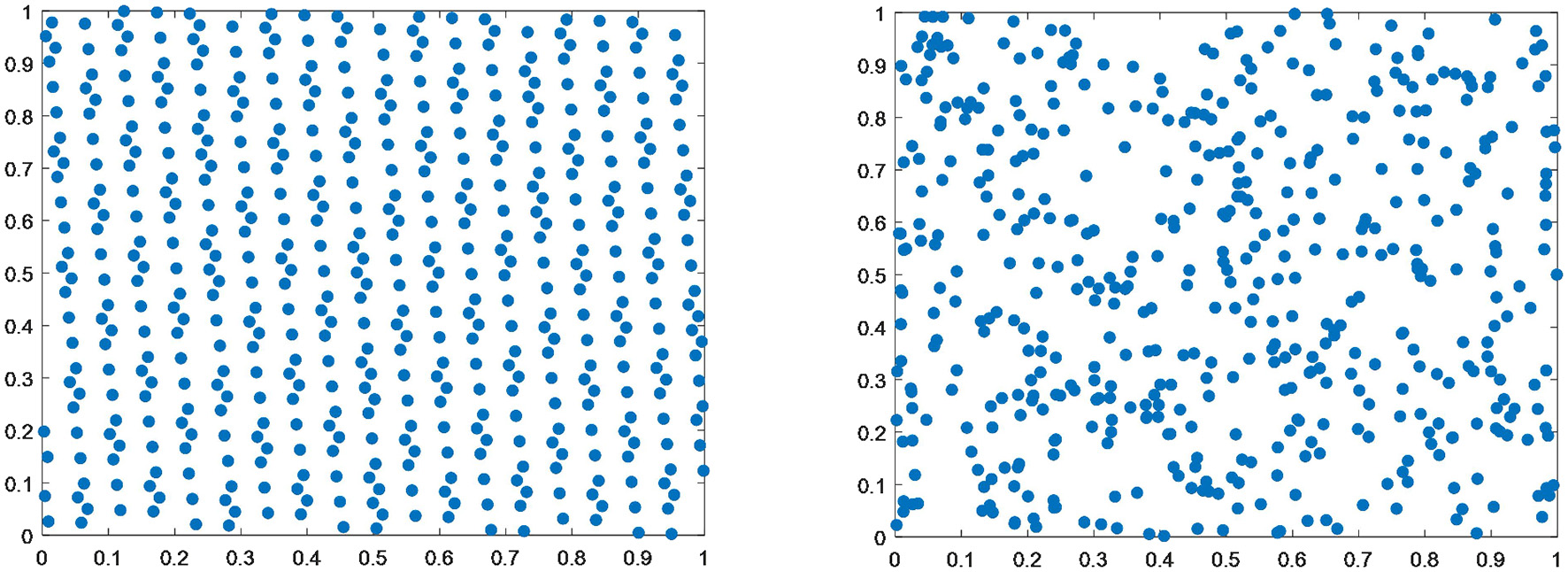 Figure 4 shows that the distribution produced by the good point set initialization process is more uniform than that of random initialization.